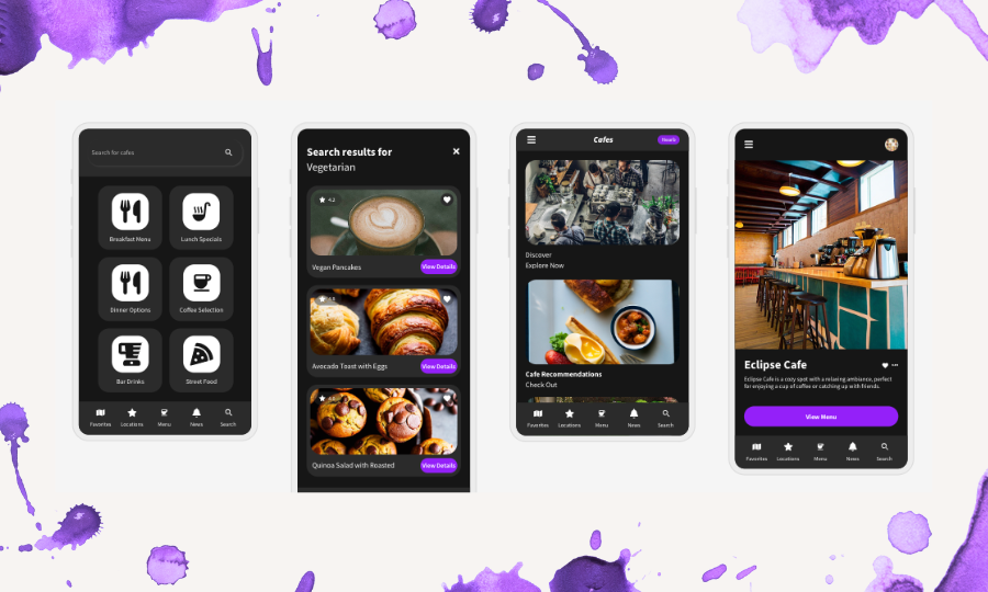 As the UI/UX designer for Eclipse Cafe, I focused on creating an intuitive and visually appealing interface. I developed wireframes, mockups, and prototypes to establish an efficient and enjoyable cafe search flow. Throughout the design process, I conducted user research to understand their needs and preferences, which were then translated into a responsive and user-centric design. The result is an application that not only looks aesthetically pleasing but also enhances the overall user experience, making finding and choosing cafes easy and enjoyable.